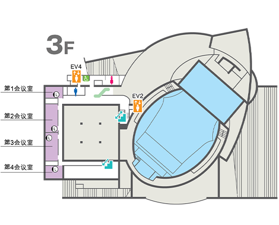 第1・第4会议室 讲堂风格24个座位 / 面积42㎡ 第2・第3会议室 讲堂风格42个座位 / 面积66㎡ |