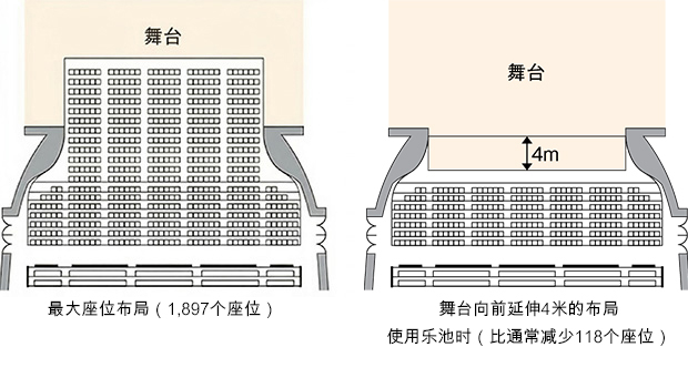 主厅舞台,采取了日本国内稀少的可动地板系统。